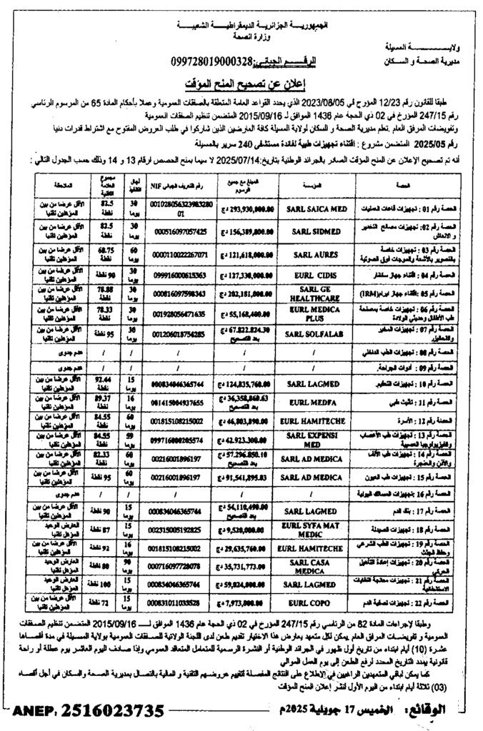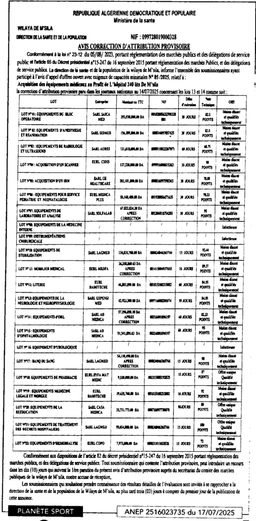إعلان عن تصحيح المنح المؤقت اقتناء تجهيزات طبية لفائدة مستشفى 240 سرير بالمسيلة/ مديرية الصحة والسكان لولاية المسيلة