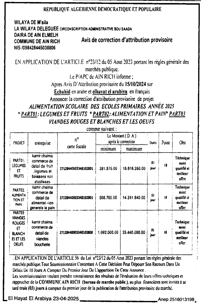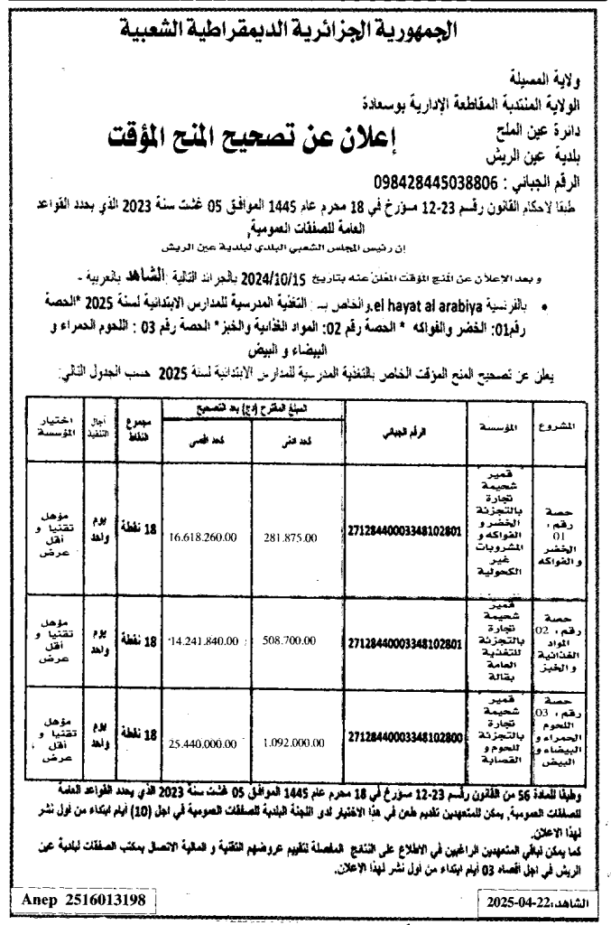 إعلان عن تصحيح المنح المؤقت التغذية المدرسية للمدارس الابتدائية لسنة 2025/ بلدية عين الريش