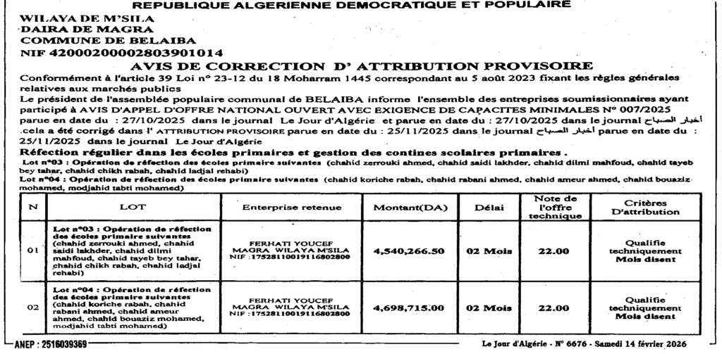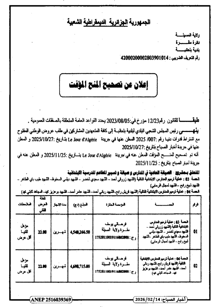 إعلان عن تصحيح المنح المؤقت الصيانة العادية في المدارس والمطاعم المدرسية/ بلدية بلعايبة