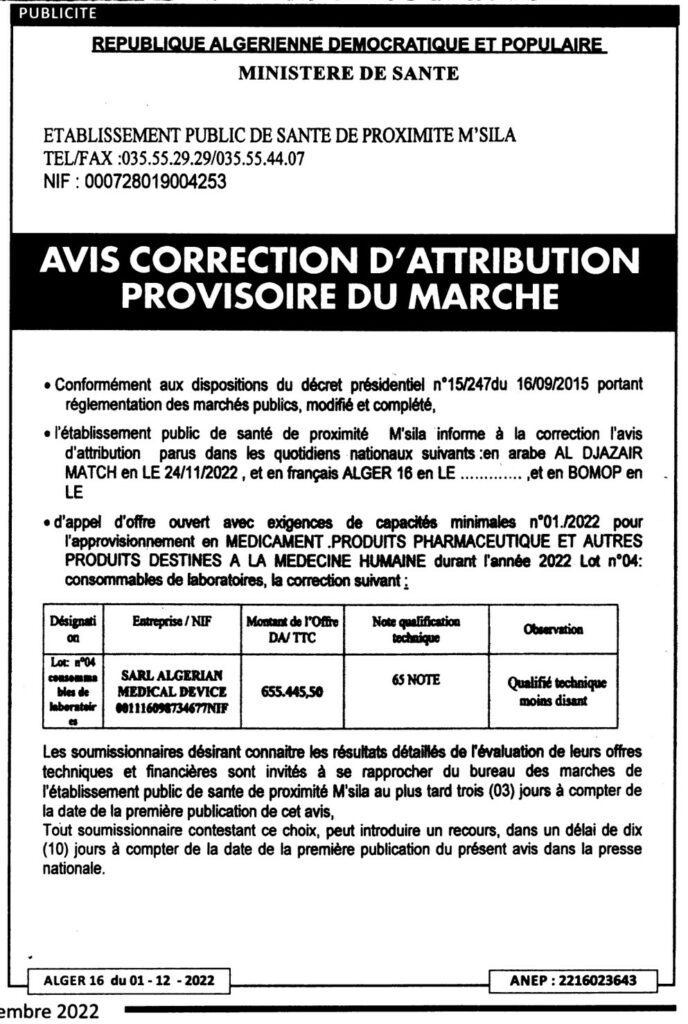 إعلان عن تصحيح المنح المؤقت المؤسسة العمومية للصحة الجوارية بالمسيلة