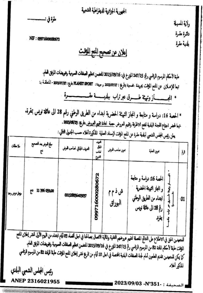 إعلان عن تصحيح المنح المؤقت: انجاز وتهيئة طرق عبر تراب ببلدية مقــرة