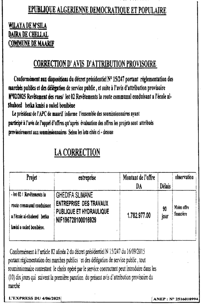 إعلان عن تصحيح المنح المؤقت بلدية المعاريف