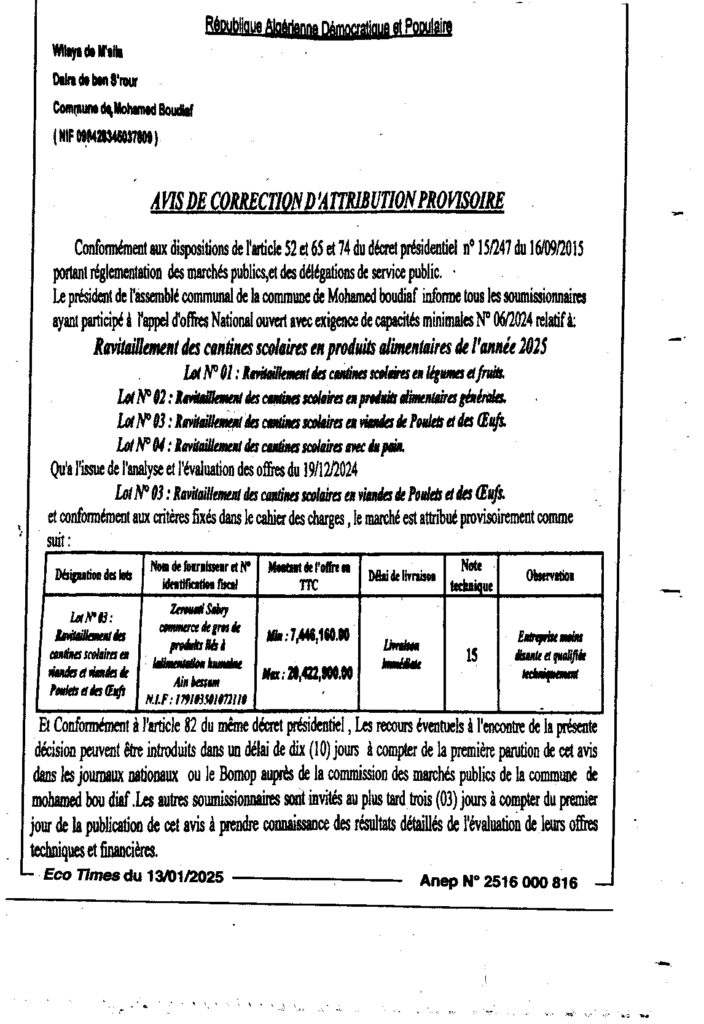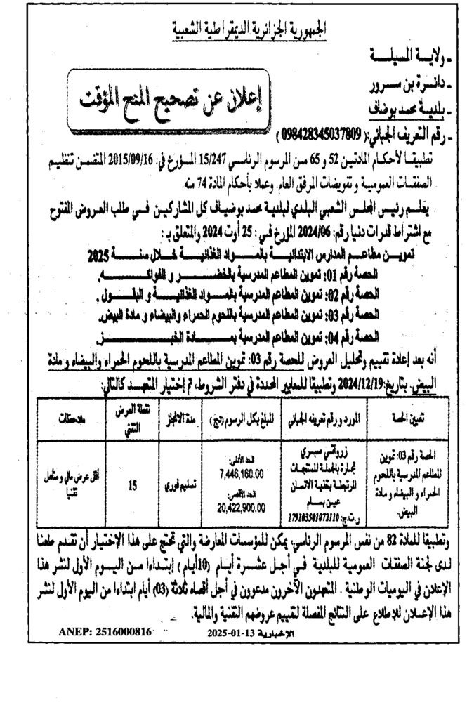 إعلان عن تصحيح المنح المؤقت تموين مطاعم المدارس الابتدائية بالمواد الغذائية خلال سنة 2025/ بلدية محمد بوضياف
