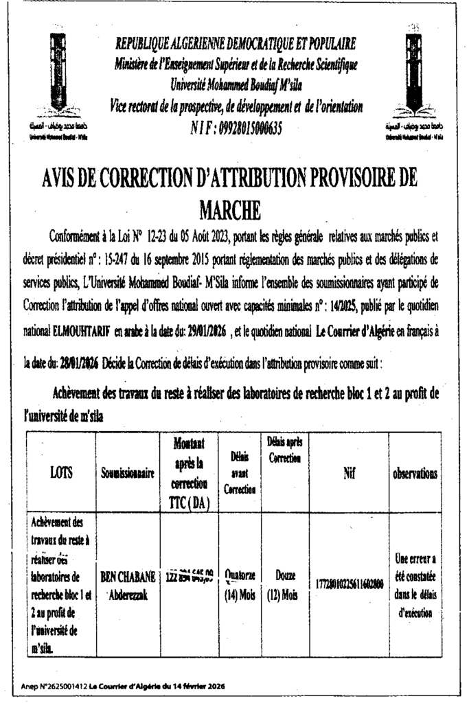 إعلان عن تصحيح المنح المؤقت/ جامعة محمد بوضياف بالمسيلة