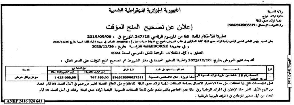 إعلان عن تصحيح المنح المؤقت كراء الحافلات للنقل المدرسي/ بلدية أولاد عدي لقبالة
