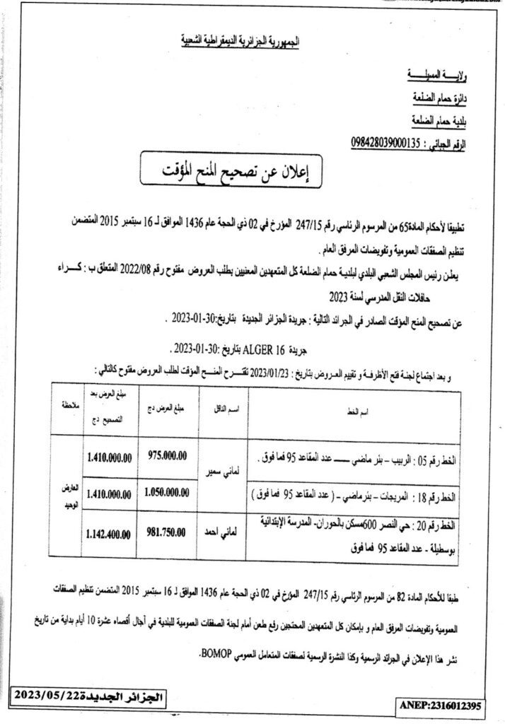إعلان عن تصحيح المنح المؤقت: كراء حافلات النقل المدرسي لسنة 2023 بلدية حمام الضلعة