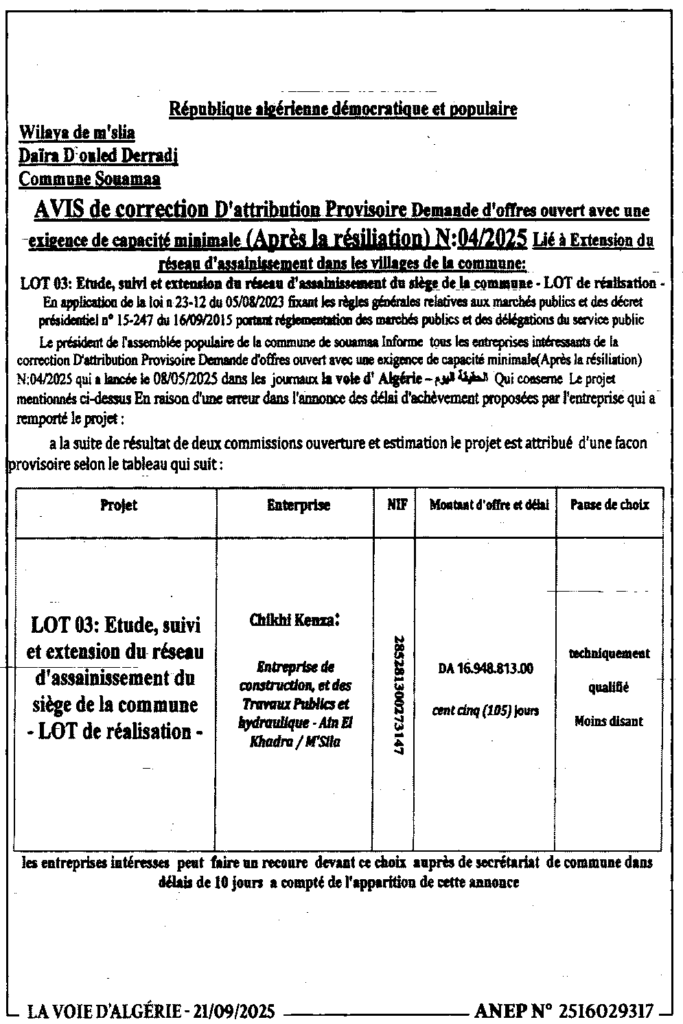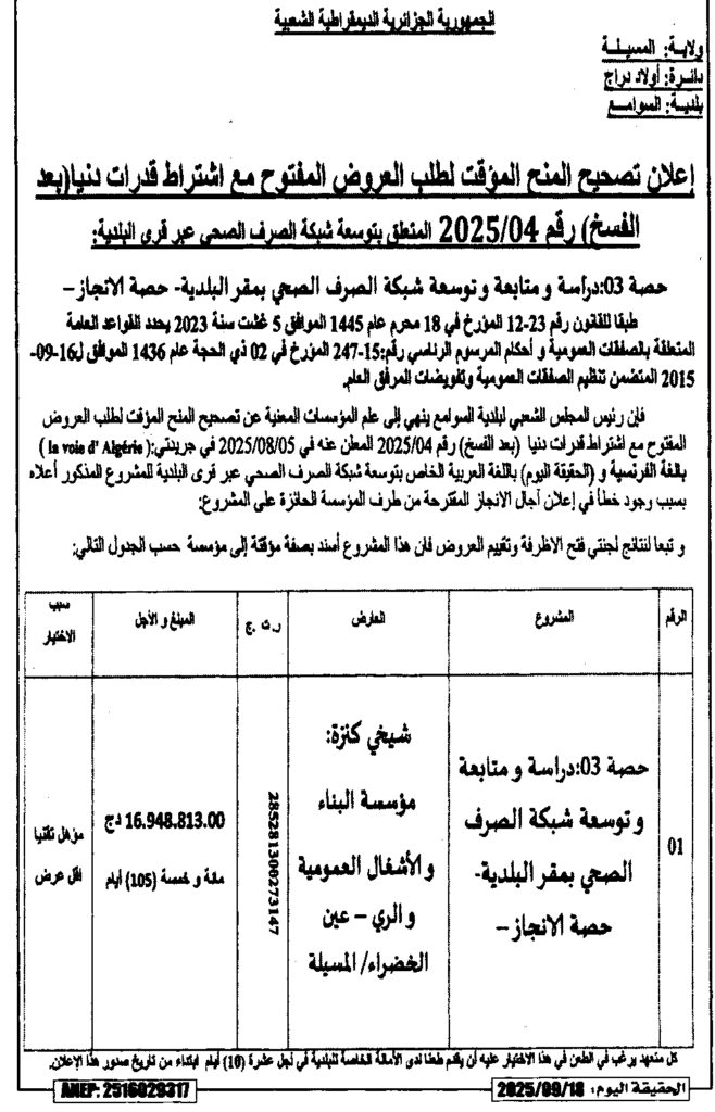 إعلان عن تصحيح المنح المؤقت لطلب العروض المفتوح (بعد الفسخ) 2025/04 المتعلق بتوسعة شبكة الصرف الصحي عبر قرى البلدية/ بلدية السوامع