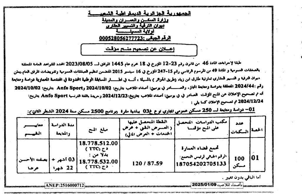 إعلان عن تصحيح المنح المؤقت لمشروع دراسة ومتابعة لـ250 مسكن عمومي ايجاري نوع غ03 ببلدية مقرة/ ديوان الترقية والتسيير العقاري لولاية المسيلة