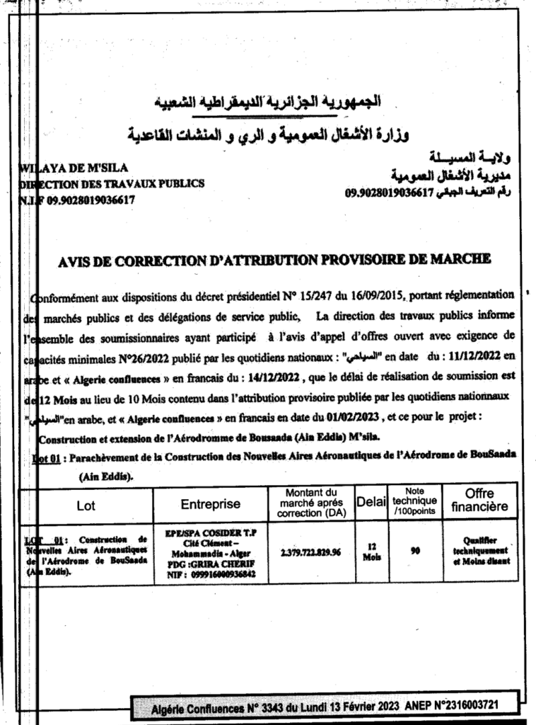 إعلان عن تصحيح المنح المؤقت/ مديرية الأشغال العمومية لولاية المسيلة