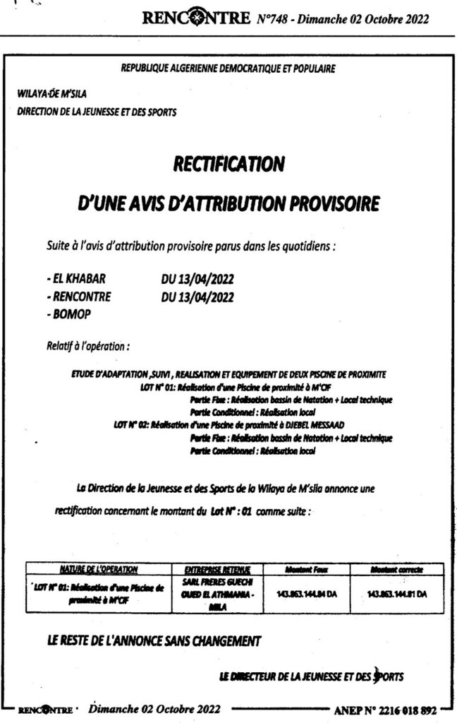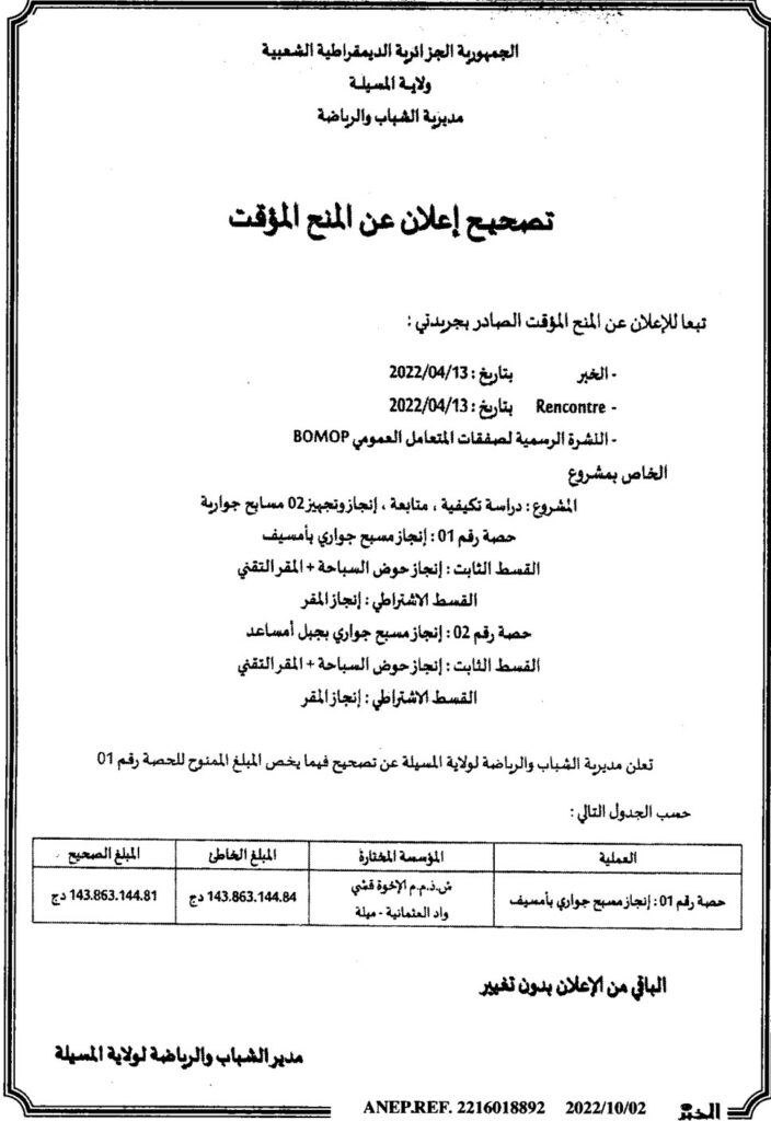 إعلان عن تصحيح المنح المؤقت مديرية الشباب والرياضة لولاية المسيلة
