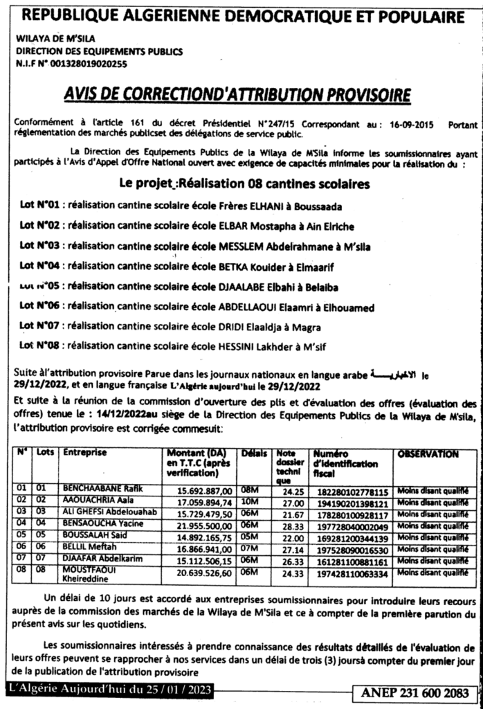 إعلان عن تصحيح المنح المؤقت/ مديرية التجهيزات العمومية لولاية المسيلة