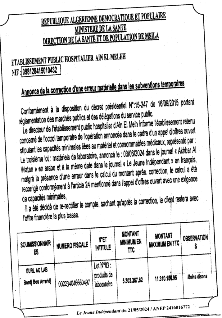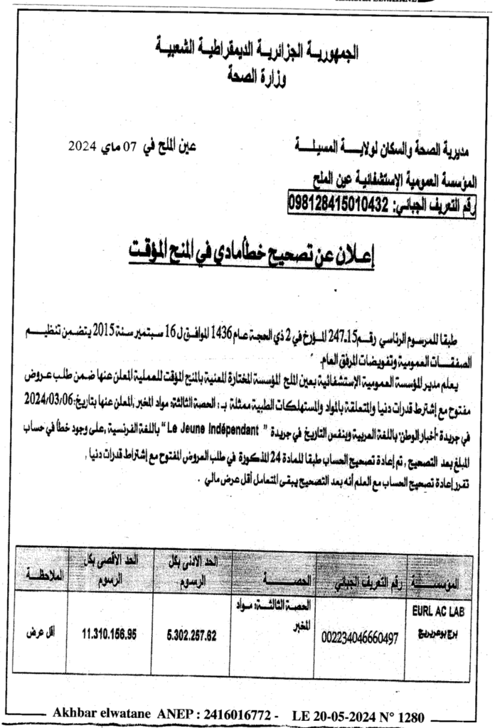 إعلان عن تصحيح خطأ مادي في المنح المؤقت/ المؤسسة العمومية الاستشفائية عين الملح