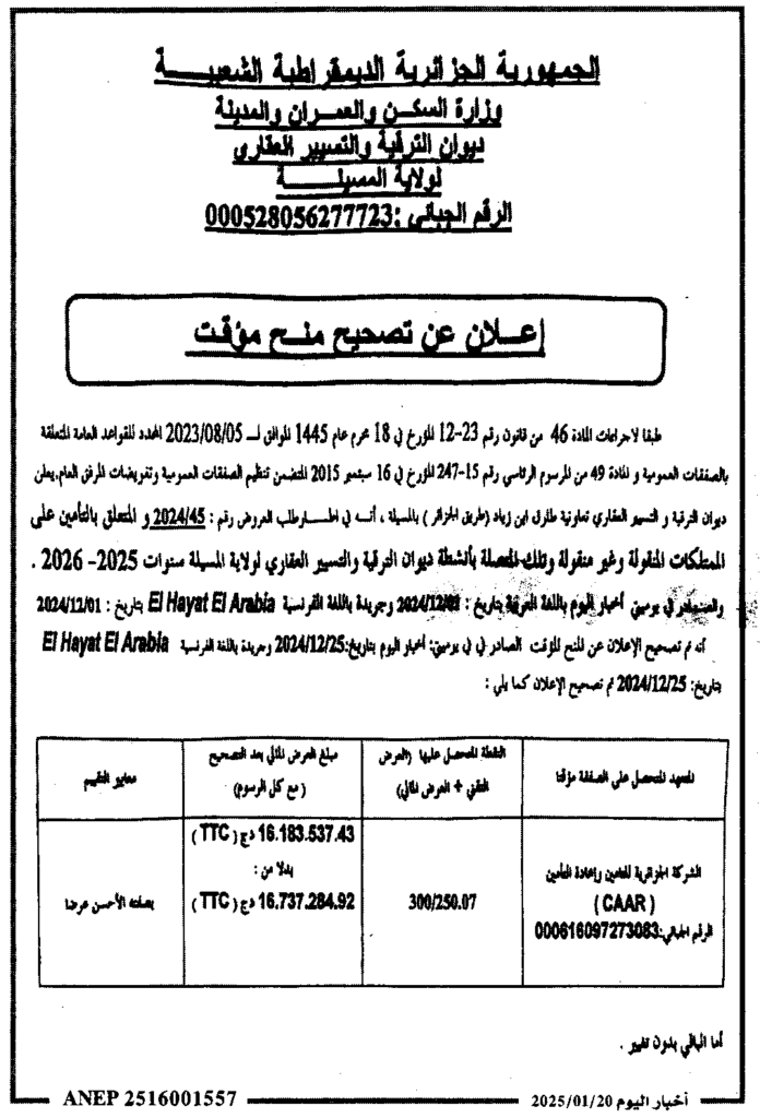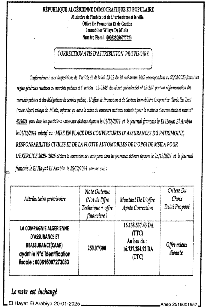 إعلان عن تصحيح منح مؤقت التأمين على الممتلكات المنقولة وغير منقولة تلك المتصلة بأنشطة ديوان الترقية والتسيير العقاري لولاية المسيلة