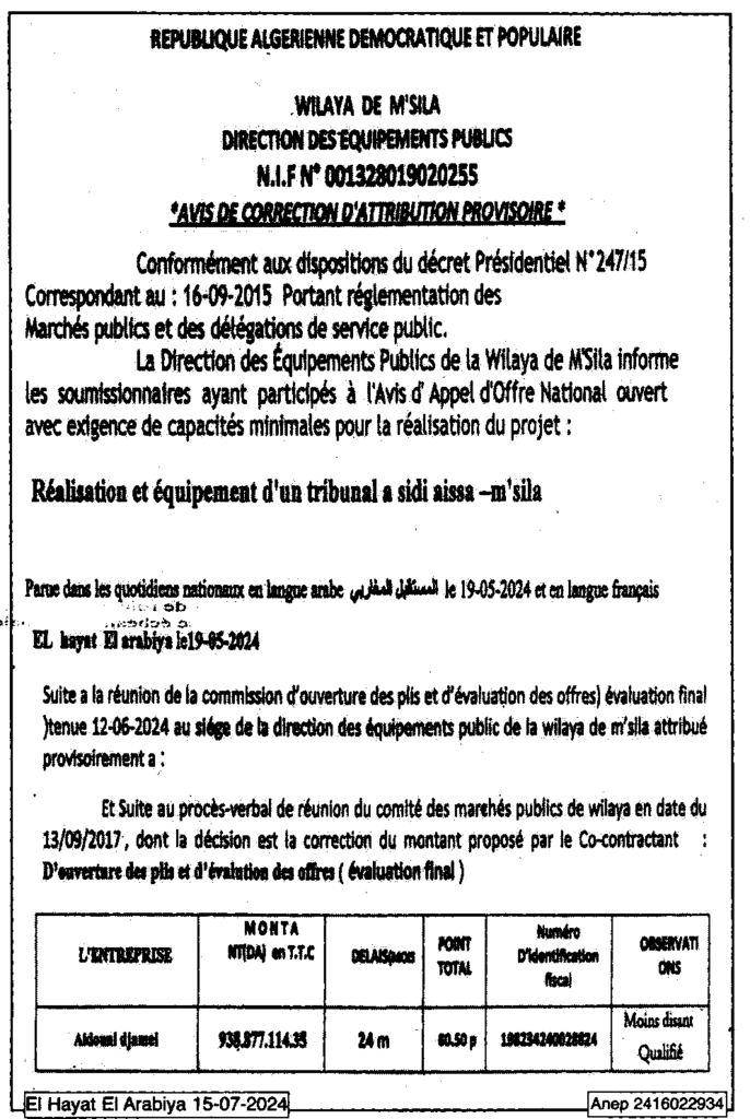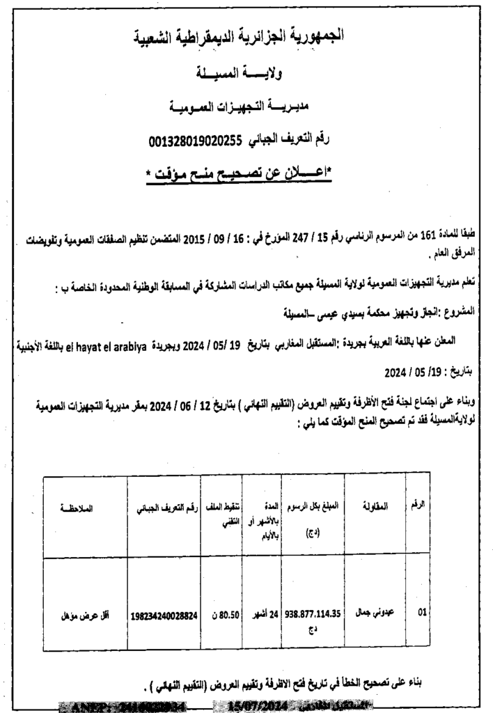 إعلان عن تصحيح منح مؤقت انجاز وتجهيز محكمة بسيدي عيسى/ مديرية التجهيزات العمومية لولاية المسيلة