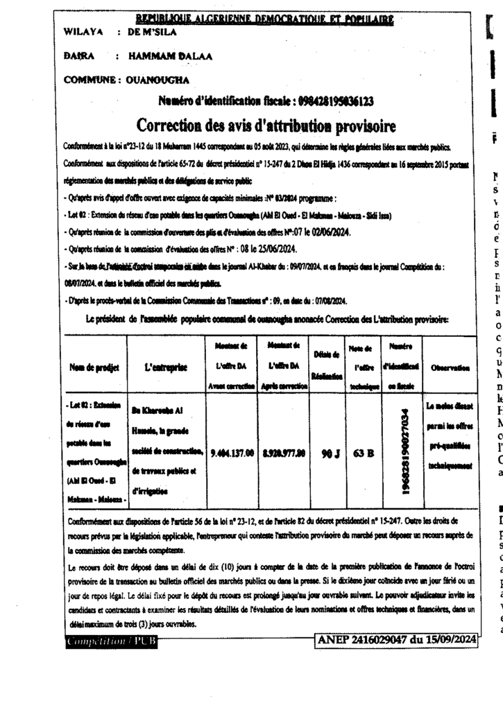 إعلان عن تصحيح منح مؤقت/ بلدية ونوغة