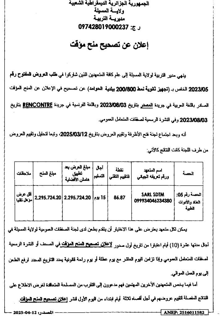 إعلان عن تصحيح منح مؤقت تجهيز ثانوية نمط 200/800 ببلدية الحوامد/ مديرية التربية لولاية المسيلة