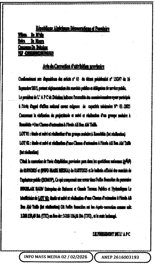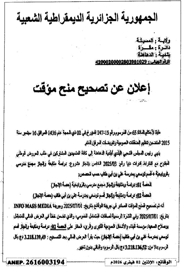 إعلان عن تصحيح منح مؤقت دراسة متابعة وانجاز مجمع مدرسي/ بلدية الدهاهنة