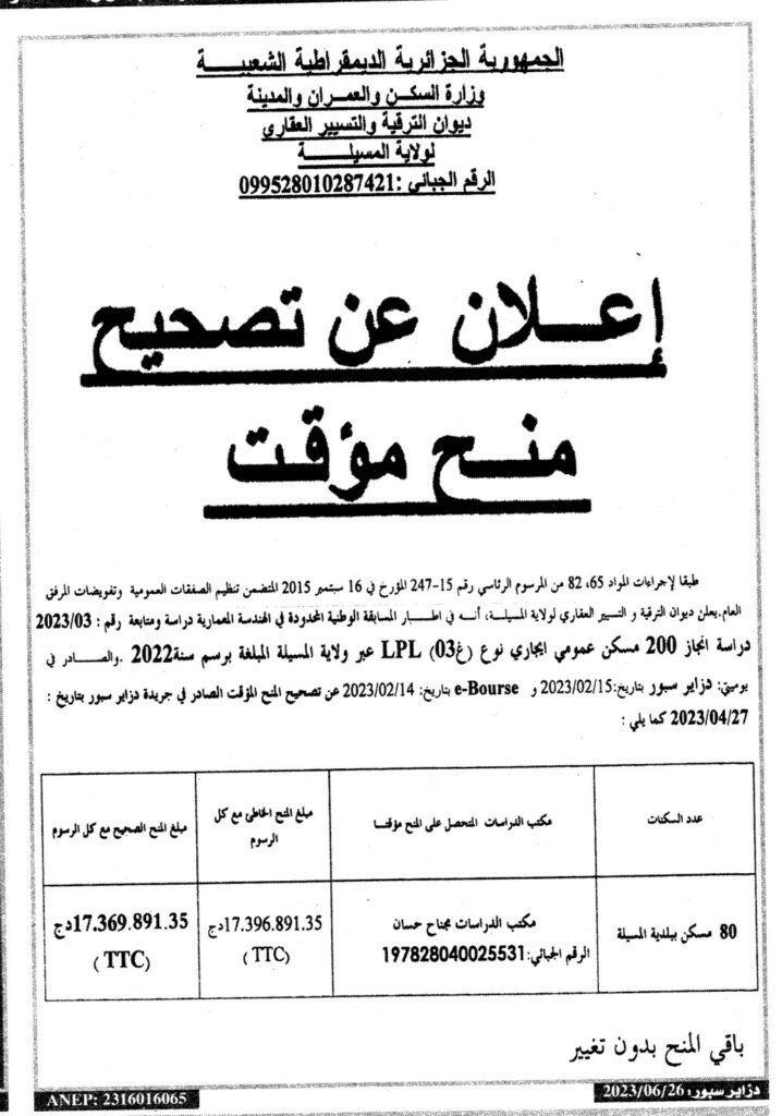 إعلان عن تصحيح منح مؤقت/ ديوان الترقية والتيسير العقاري لولاية المسيلة
