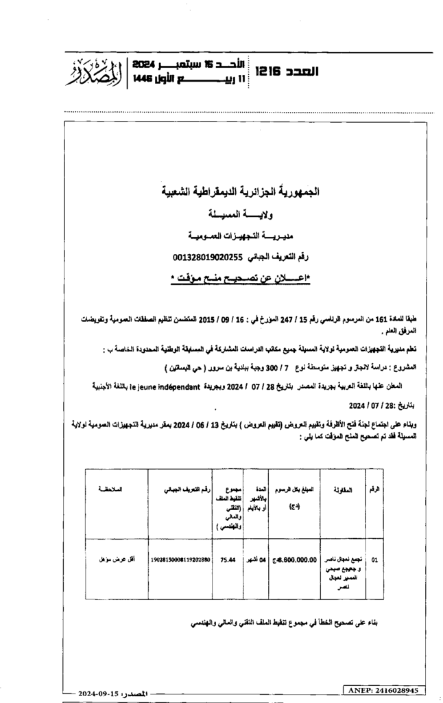 إعلان عن تصحيح منح مؤقت/ مديرية التجهيزات العمومية لولاية المسيلة