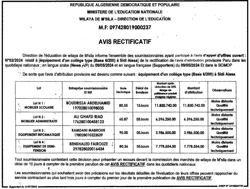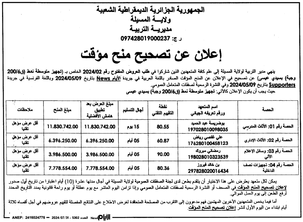 إعلان عن تصحيح منح مؤقت/ مديرية التربية لولاية المسيلة