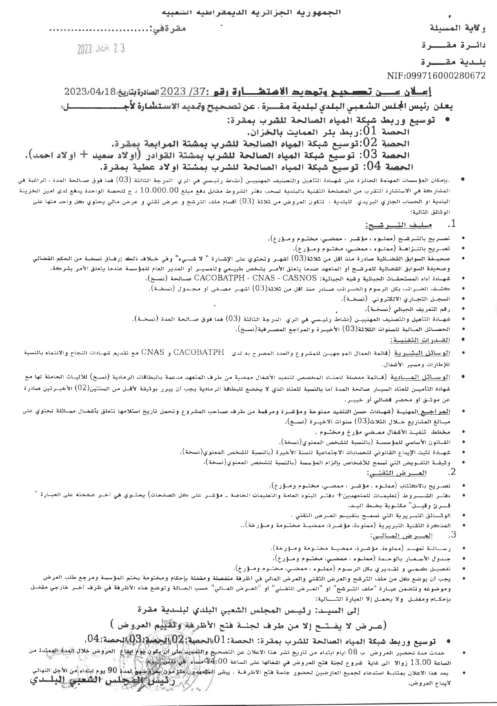 إعلان عن تصحيح وتمديد الاستشارة 2023/37 بلدية مقرة