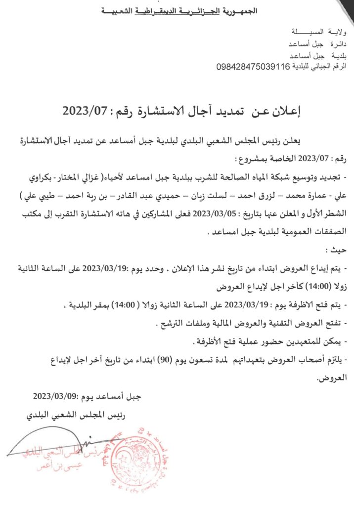 إعلان عن تمديد آجال الاستشارة 2023/07 بلدية جبل امساعد
