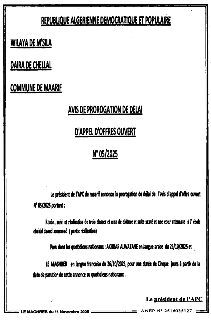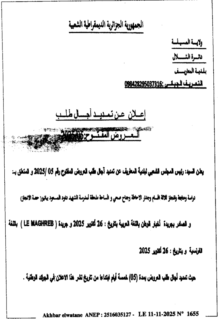 إعلان عن تمديد آجال طلب العروض المفتوح 2025/05 بلدية المعاريف