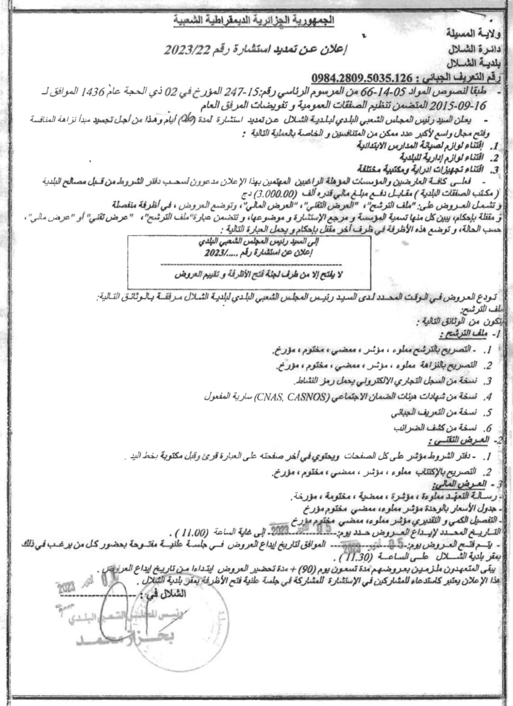 استشارة من أجل: اقتناء (لوازم لصيانة المدارس الابتدائية-لوازم ادارية للبلدية-تجهيزات ادارية ومكتبية مختلفة)4 أكتوبر، 20230 14 شاركها فيسبوك X مشاركة عبر البريد طباعة
