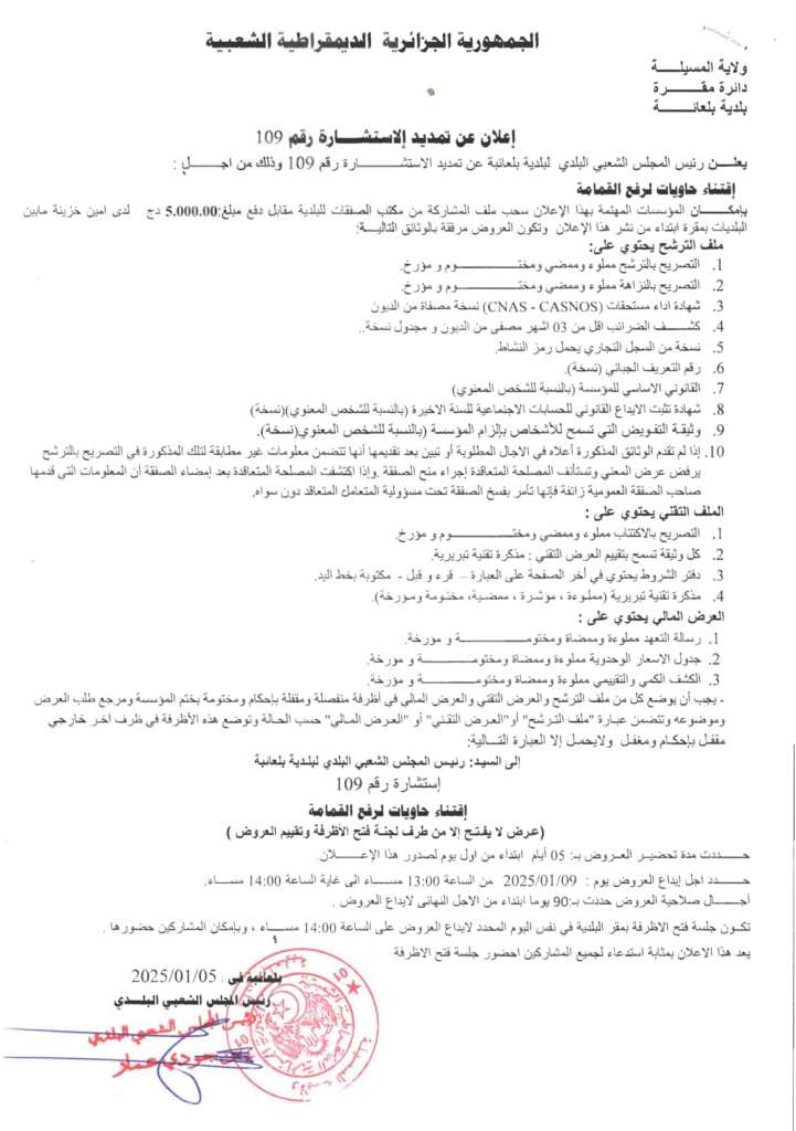 إعلان عن تمديد الاستشارة 2024/109 بلدية بلعايبة