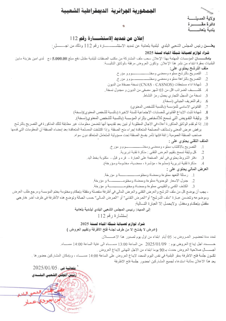إعلان عن تمديد الاستشارة 2024/112 بلدية بلعايبة
