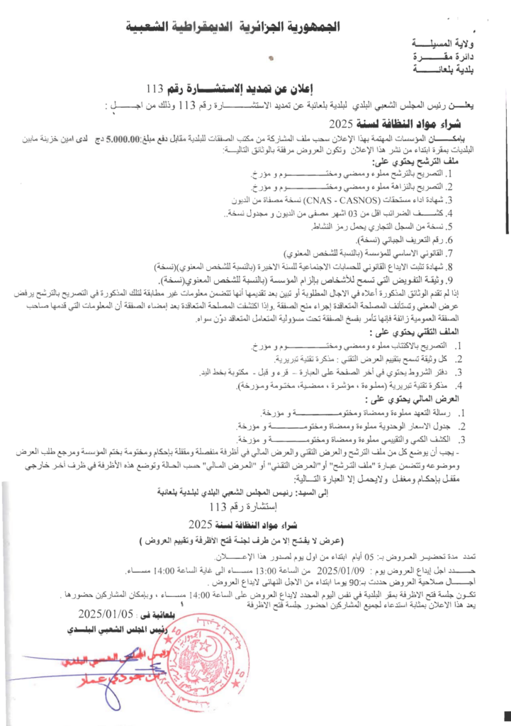 استشارة من أجل: شراء مواد النظافة لسنة 20255 يناير، 20250 18 شاركها فيسبوك X مشاركة عبر البريد طباعة
