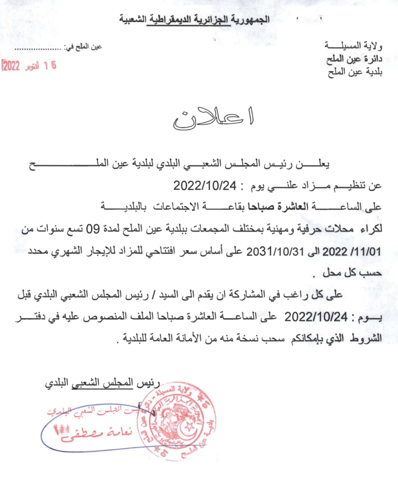 إعلان عن تنظيم مزاد علني يوم 24 أكتوبر 2022 ببلدية عين الملح لكراء محلات حرفية ومهنية بمختلف المجمعات لمدة 09 سنوات