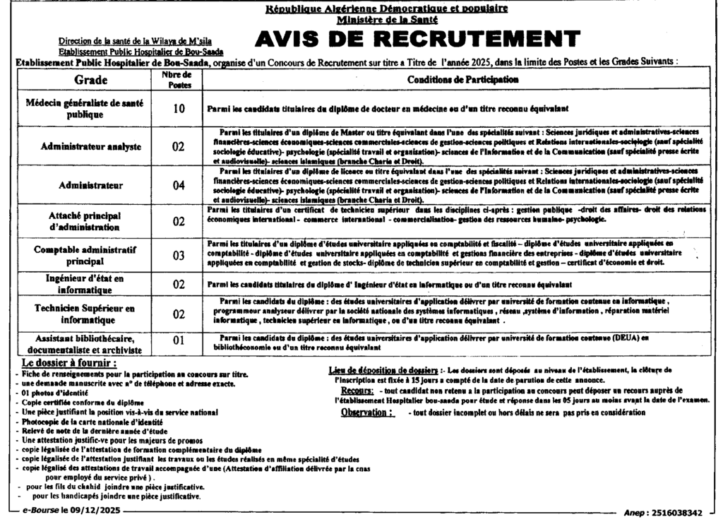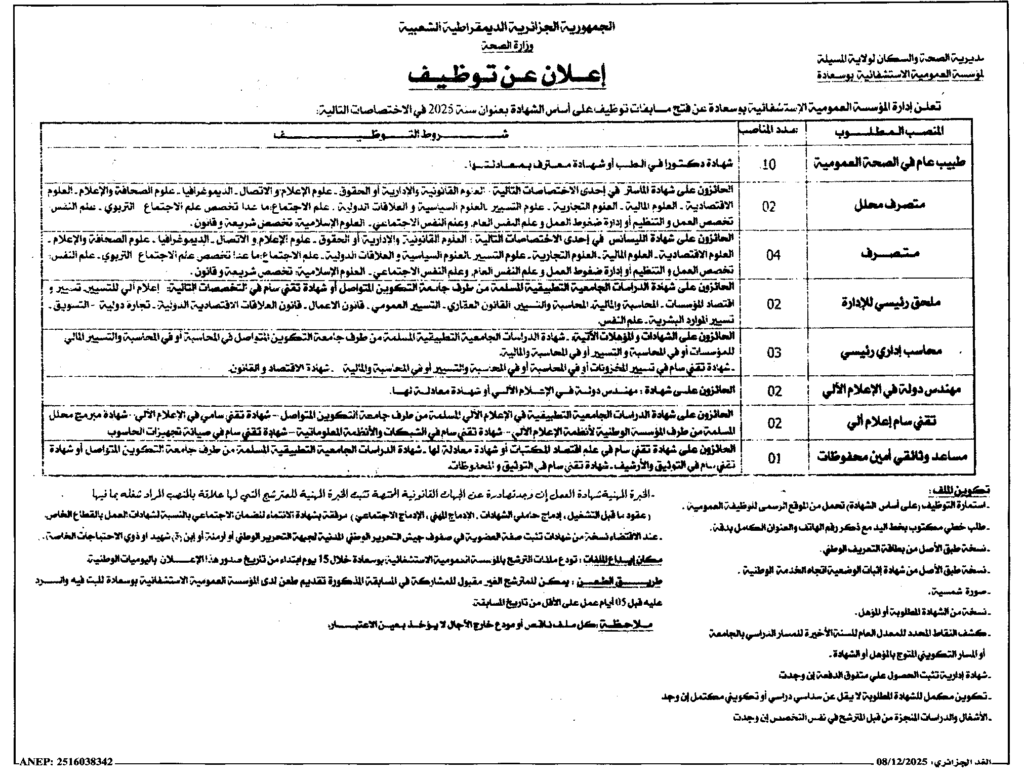 إعلان عن توظيف المؤسسة العمومية الاستشفائية بوسعادة