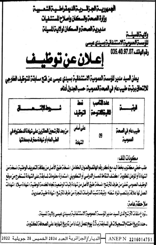 تعلن المؤسسة العمومية الإستشفائية سيدي عيسى عن فتح مسابقة للتوظيف الخارجي للإلتحاق برتبة: طبيب عام في الصحة العمومية28 يوليو، 20220 31 شاركها فيسبوك X مشاركة عبر البريد طباعة
