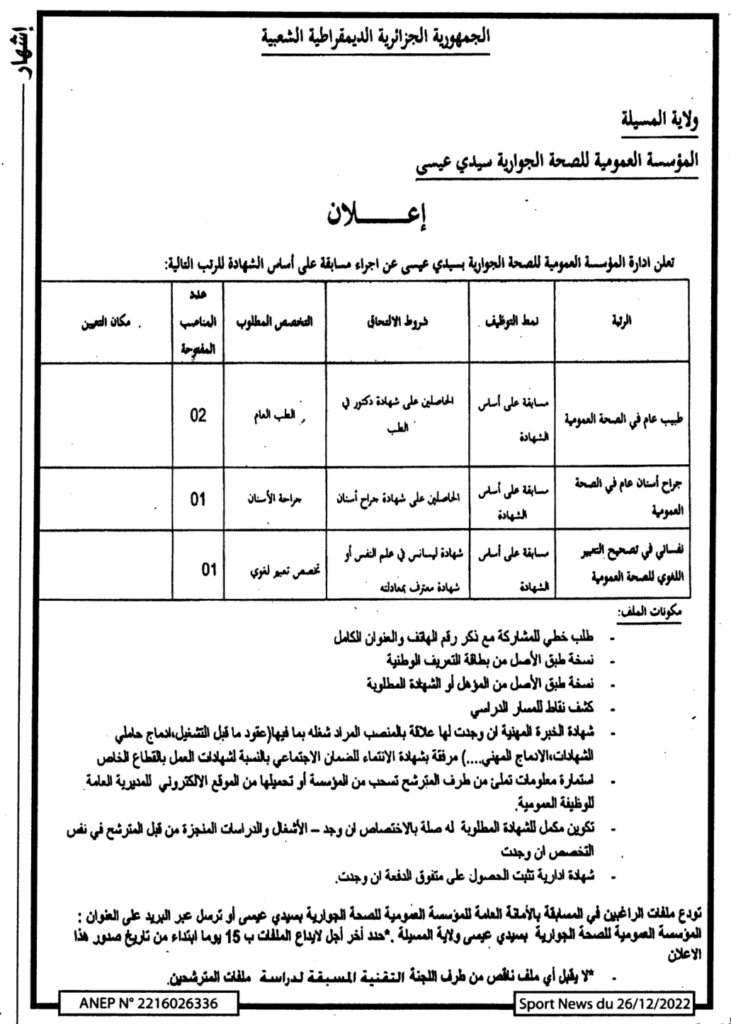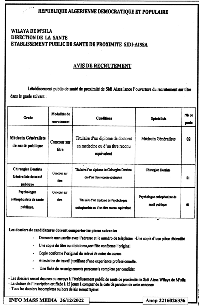 إعلان عن توظيف المؤسسة العمومية للصحة الجوارية سيدي عيسى
