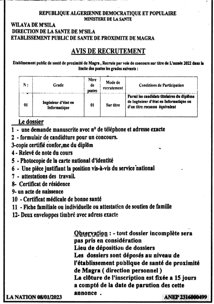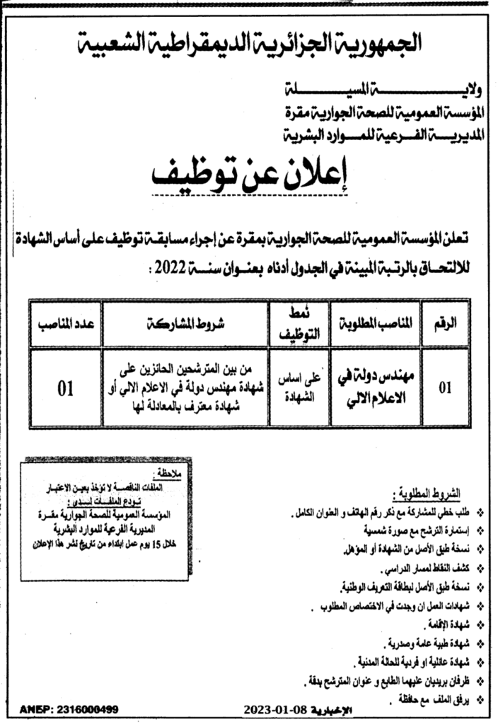 إعلان عن توظيف/ المؤسسة العمومية للصحة الجوارية مقرة