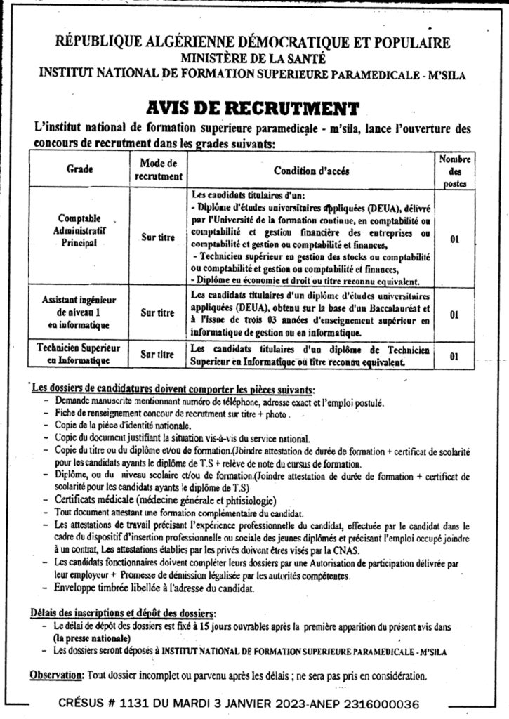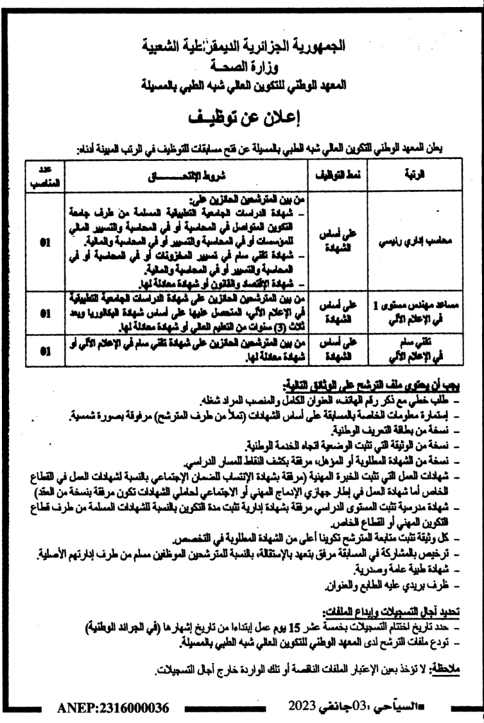 إعلان عن توظيف/ المعهد الوطني للتكوين العالي شبه الطبي المسيلة