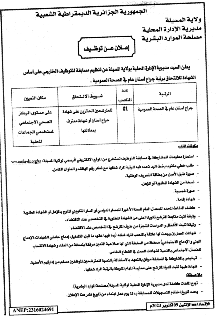 إعلان عن توظيف: جراح أسنان عام/ مديرية الادارة المحلية لولاية المسيلة