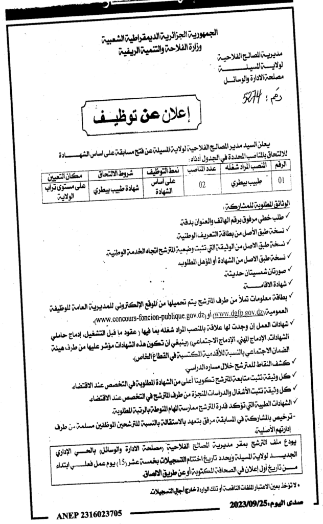 إعلان عن توظيف طبيب بيطري/ مديرية المصالح الفلاحية