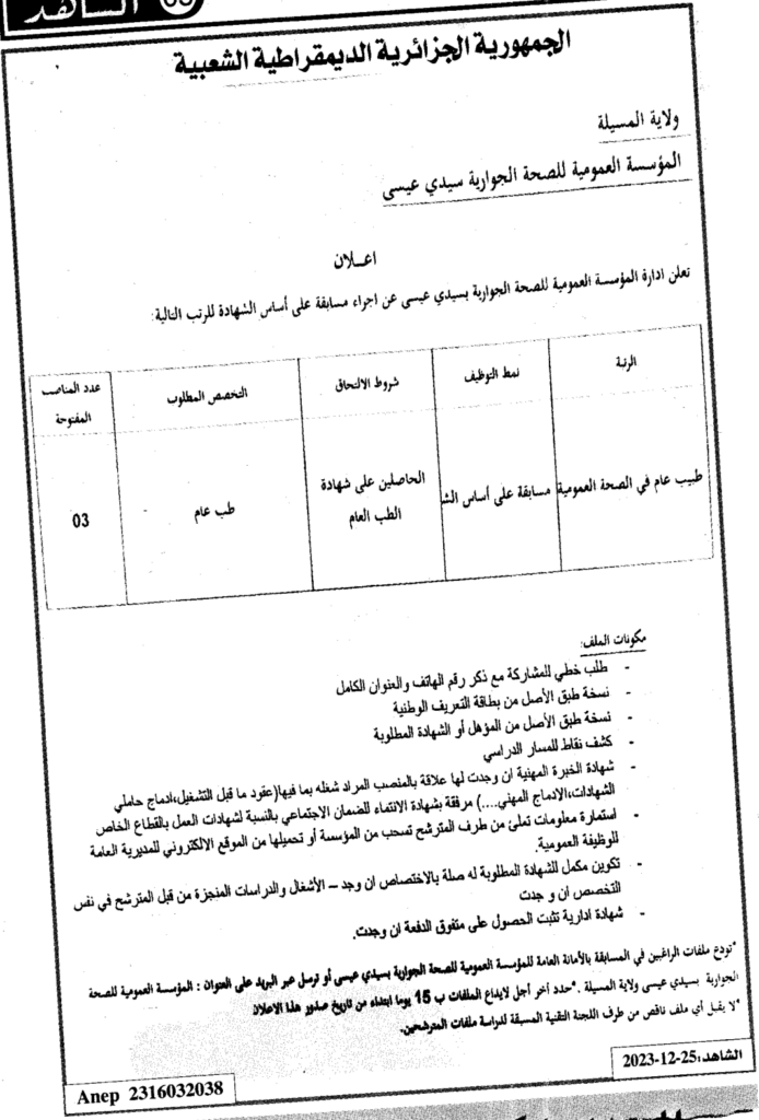 إعلان عن توظيف: طبيب عام في الصحة الجوارية/ المؤسسة العمومية للصحة الجوارية سيدي عيسى