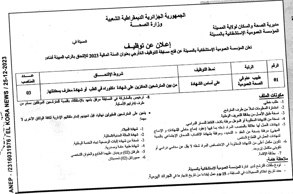 إعلان عن توظيف: طبيب عام في الصحة العمومية/ المؤسسة العمومية الاستشفائية بالمسيلة