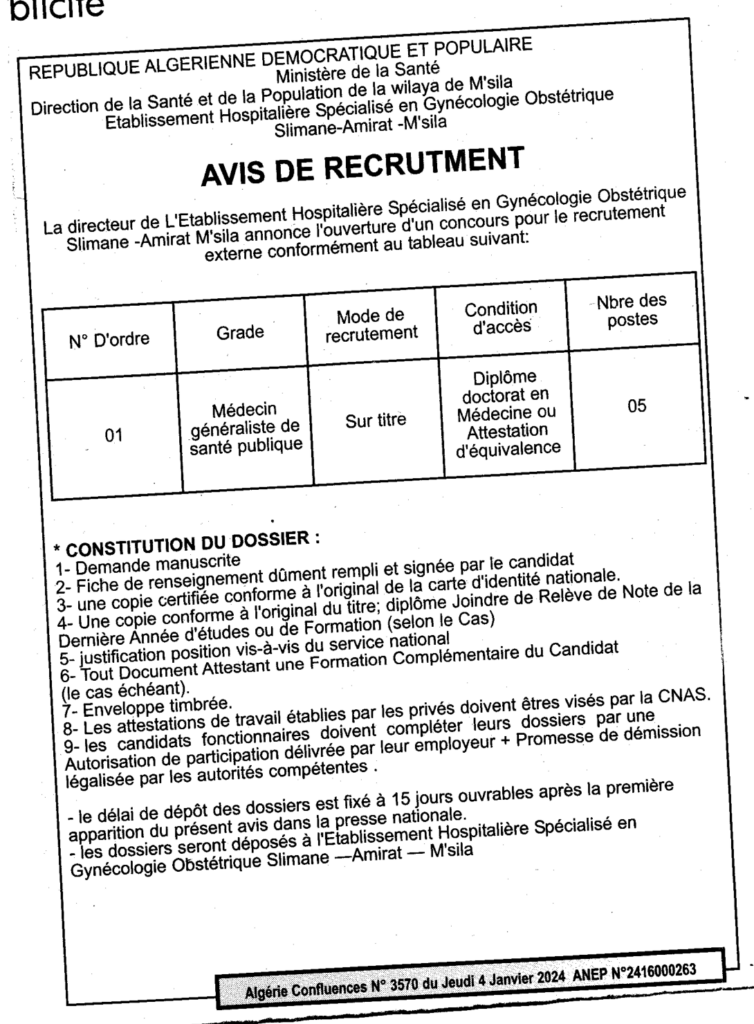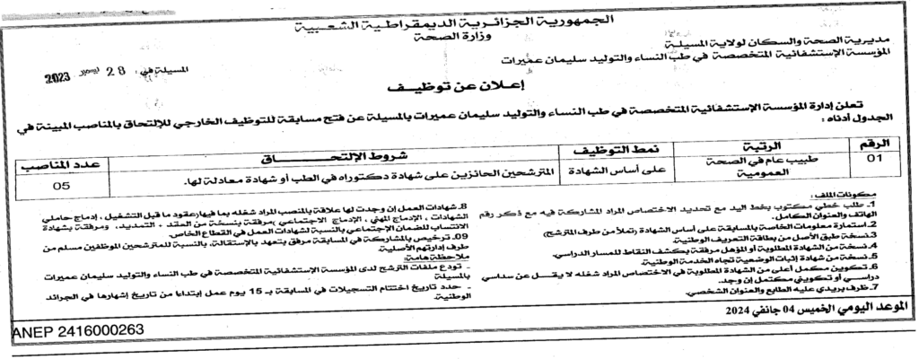 إعلان عن توظيف طبيب عام في الصحة العمومية/ المؤسسة الاستشفائية المتخصصة في طب النساء والتوليد المسيلة