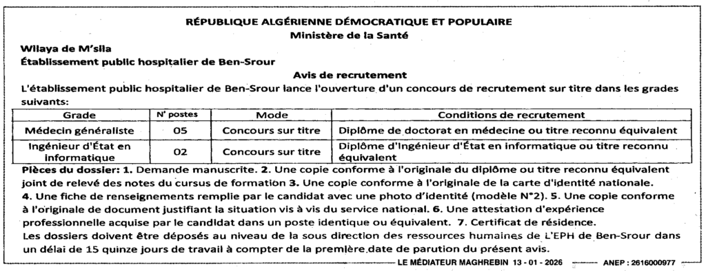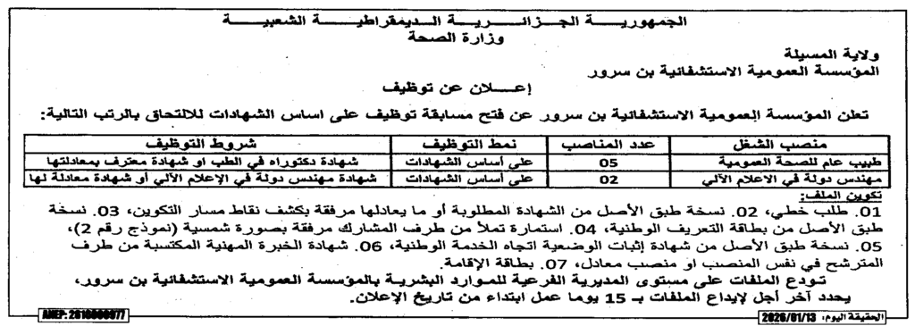 إعلان عن توظيف طبيب عام للصحة الجوارية ومهندس دولة/ المؤسسة العمومية الاستشفائية بن سرور
