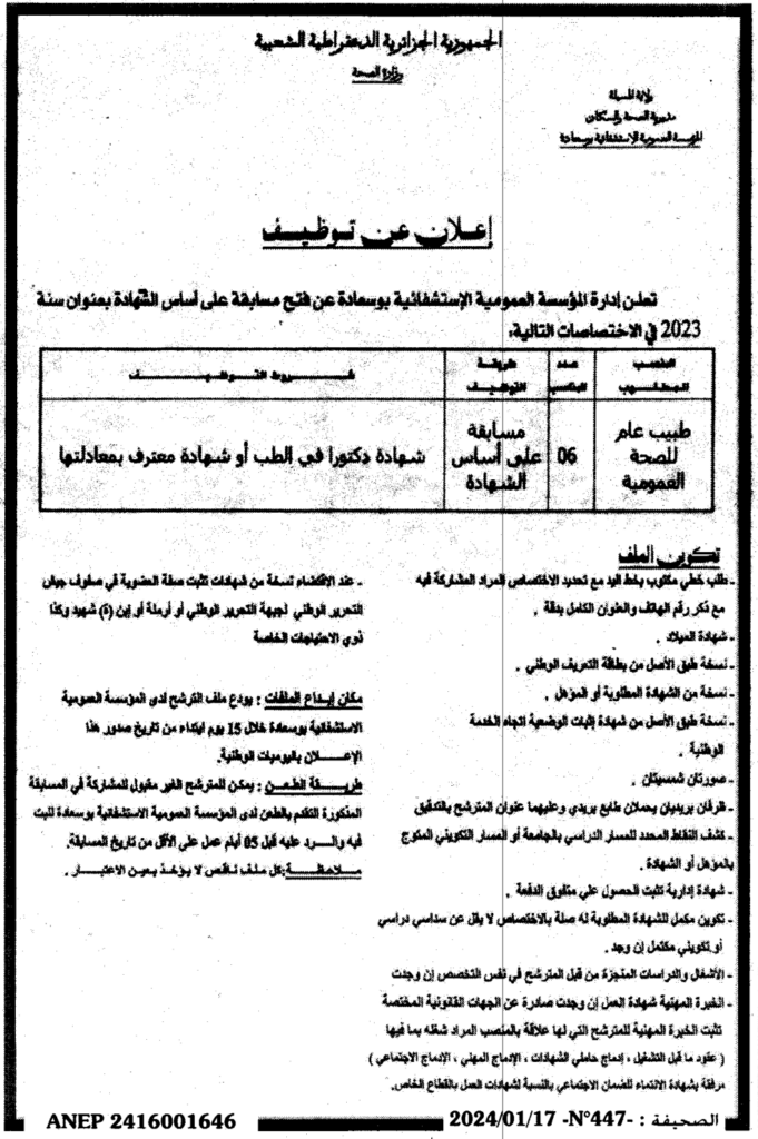 إعلان عن توظيف: طبيب عام للصحة العمومية/ المؤسسة العمومية الاستشفائية بوسعادة