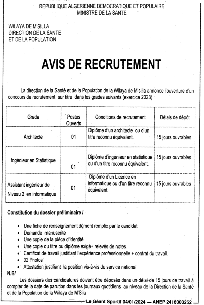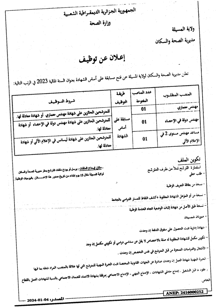 إعلان عن توظيف على أساس الشهادة للسنة المالية 2023/ مديرية الصحة والسكان لولاية المسيلة