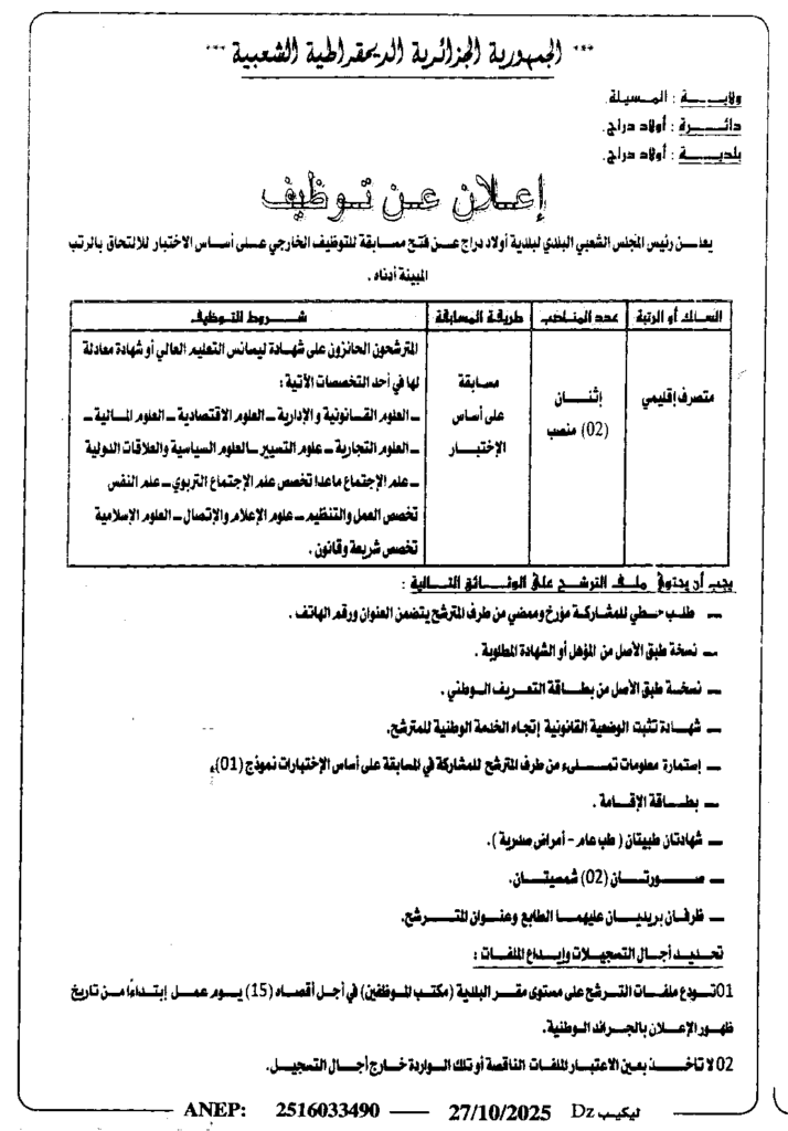 إعلان عن توظيف متصرف اقليمي/ بلدية أولاد دراج