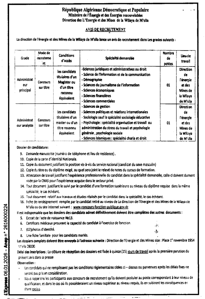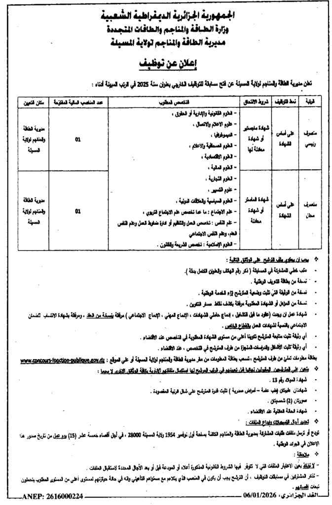 إعلان عن توظيف متصرف رئيسي ومتصرف محلل/ مديرية الطاقة والمناجم لولاية المسيلة