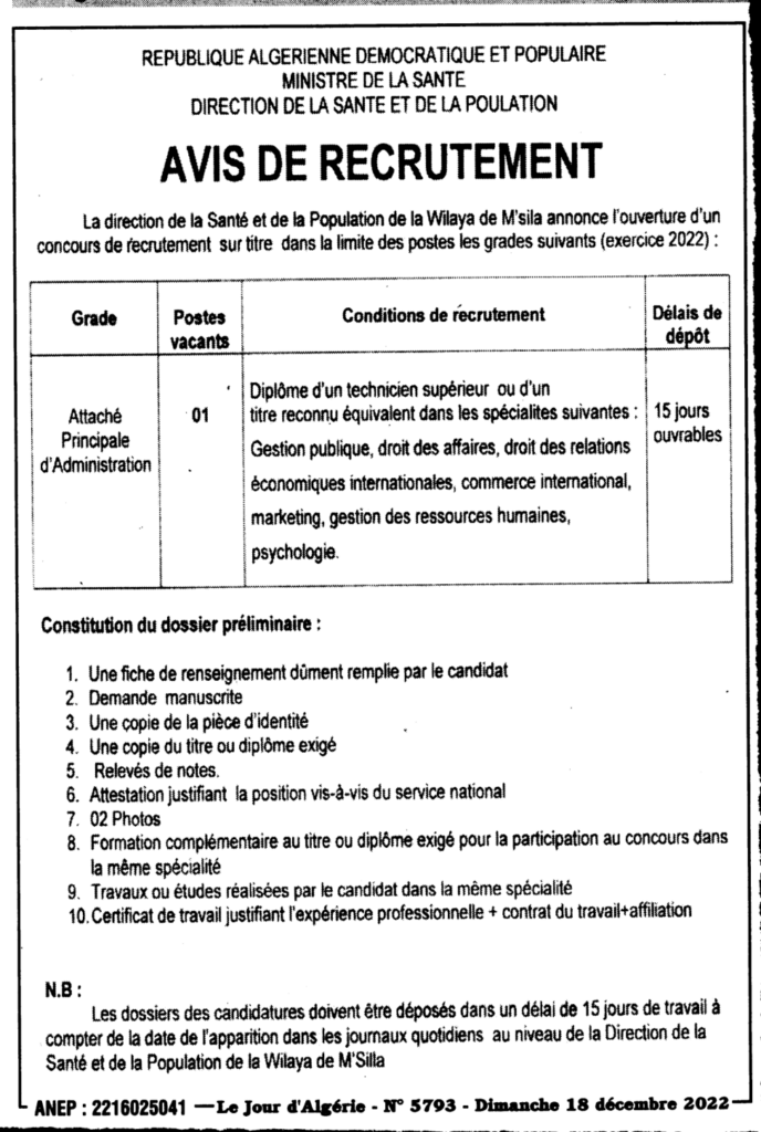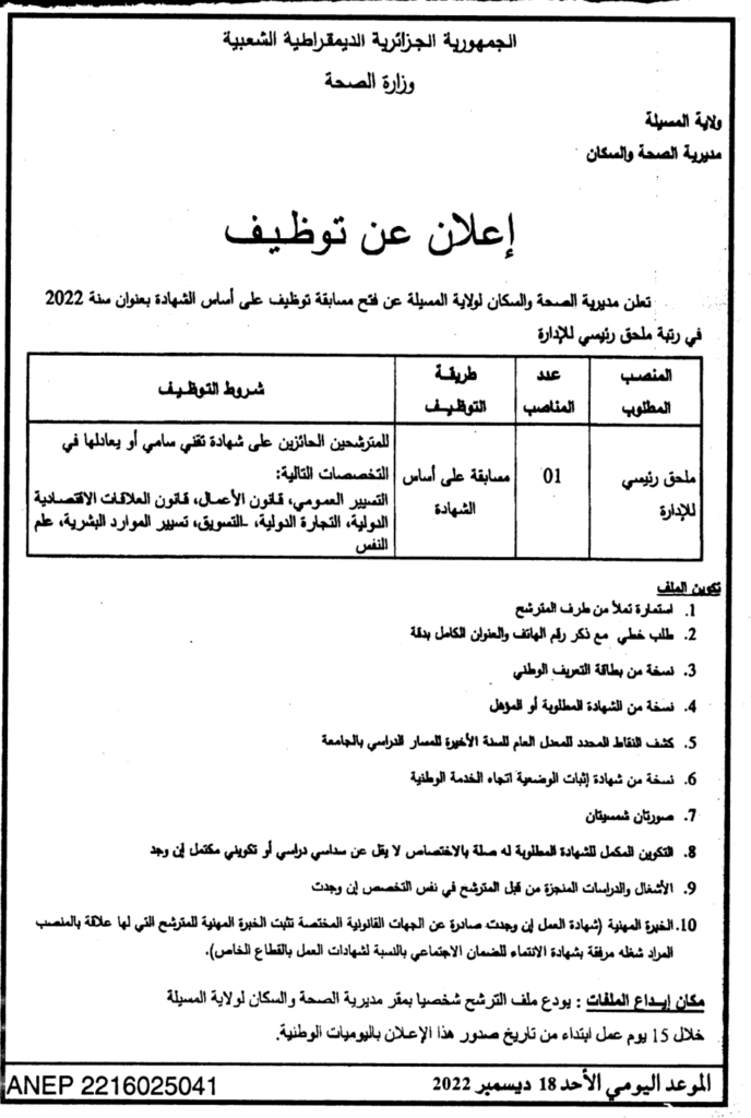إعلان عن توظيف/ مديرية الصحة والسكان