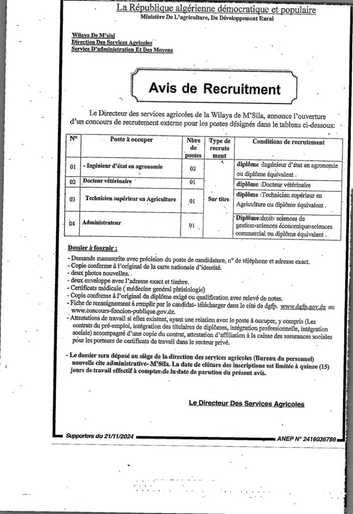 إعلان عن توظيف/ مديرية المصالح الفلاحية لولاية المسيلة