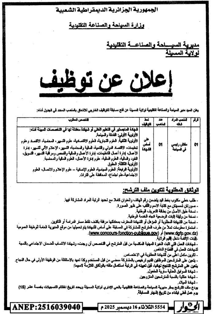 إعلان عن توظيف مفتش رئيسي/ مديرية السياحة والصناعة التقليدية لولاية المسيلة